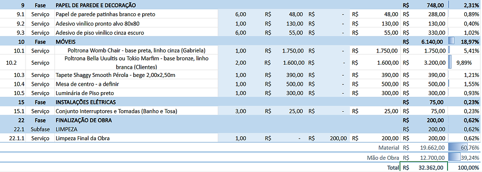Preparamos uma planilha de orçamento por etapa de serviço. Pra cada etapa que for executar é só ir adicionando na planilha e ela calcula o valor total por etapa e a porcentagem dela.